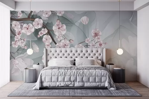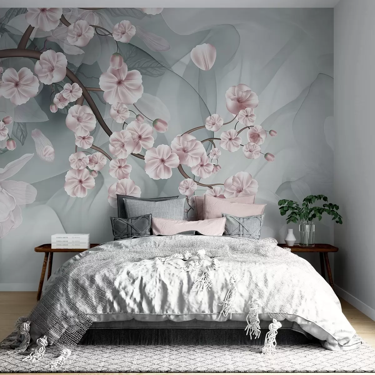 Fototapet Körsbärsblommans grenar med rosa blommor och kronblad, bruna grenar, abstrakt dämpad bakgrund med flödande effekt Nr. w09054