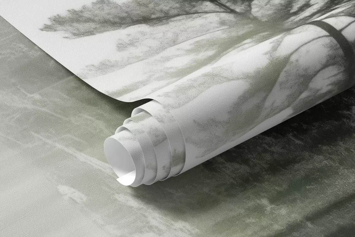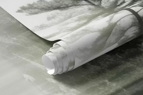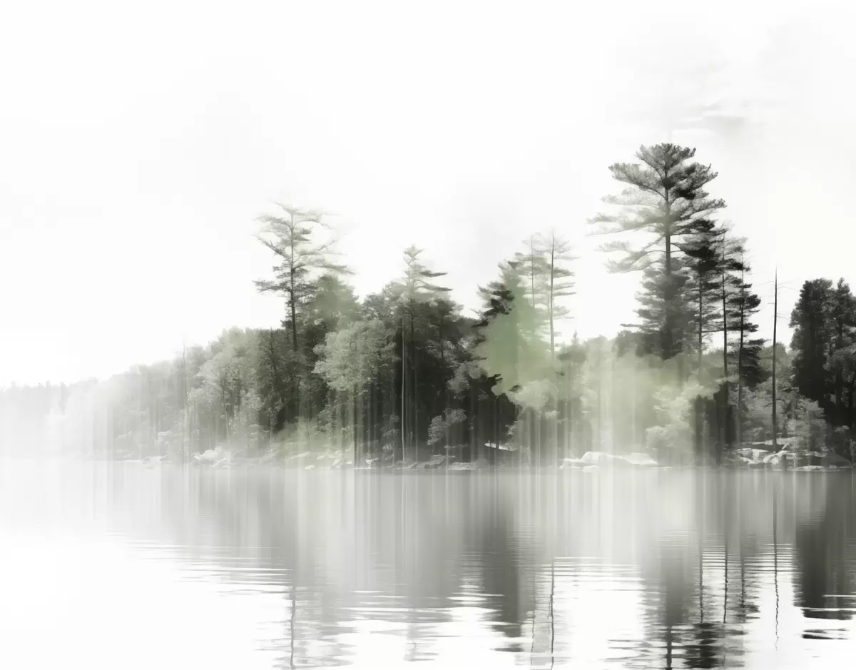Fototapet Abstrakt minimalistiskt texturerat landskap med en sjö och träd som speglar sig i vattnet i gröna och vita nyanser Nr. w09058