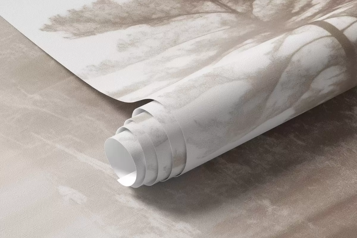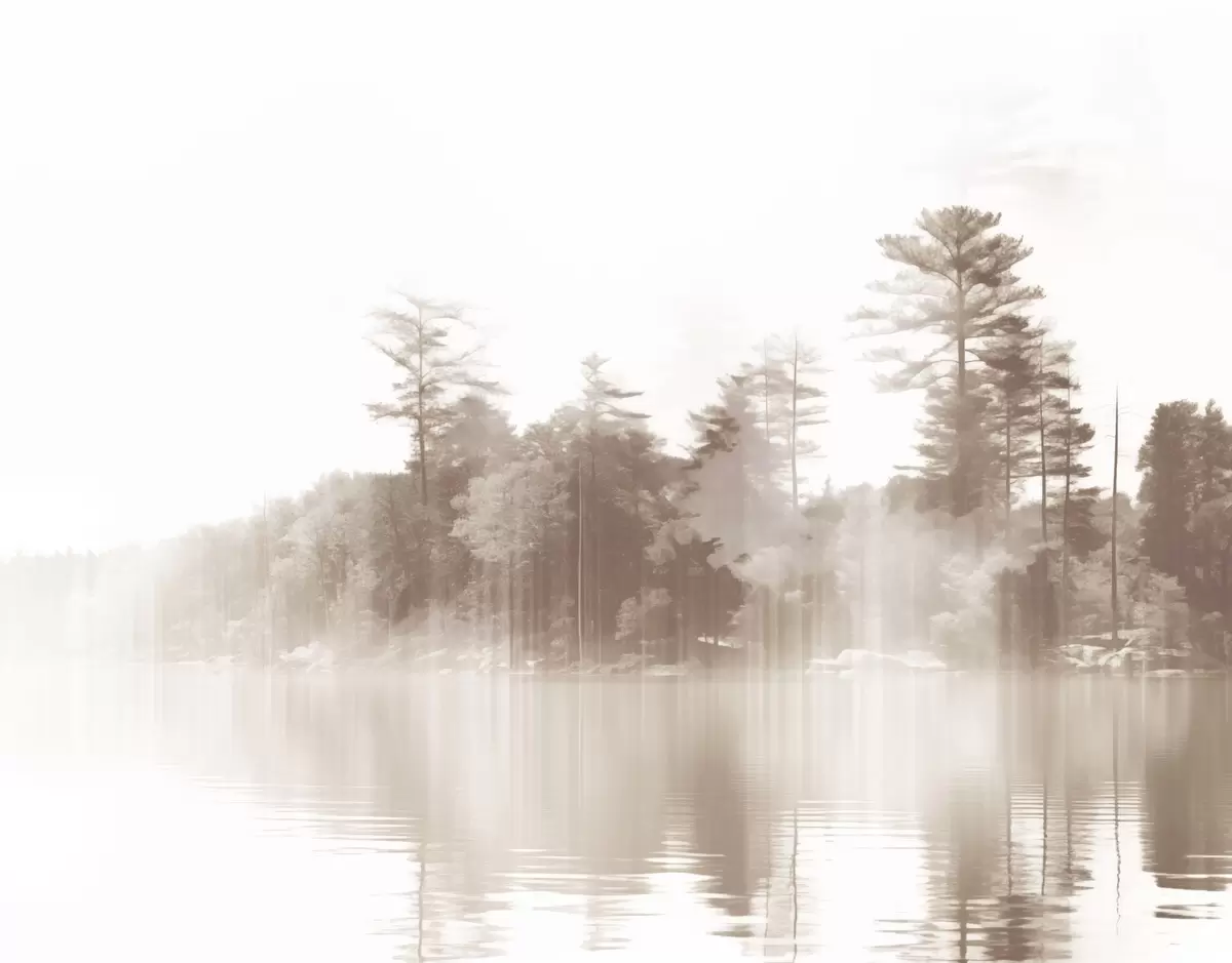 Fototapet Abstrakt minimalistiskt texturerat landskap med en sjö och träd som speglar sig i vattnet i beige och vita nyanser Nr. w09058v1