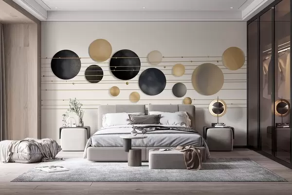 Fototapet Abstrakt modern design med texturerade cirklar i vita, gula och grå toner, förbundna med tunna linjer, minimalistisk konst  w09060
