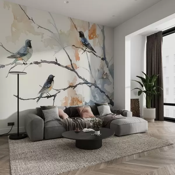 Fototapet Fåglar på trädgrenar i akvarellstil Nr. w09064