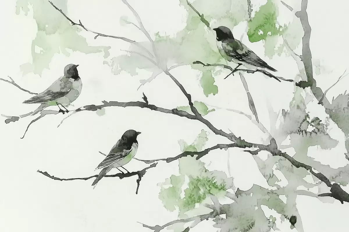 Fototapet Fåglar på trädgrenar i akvarellstil Nr. w09064v3