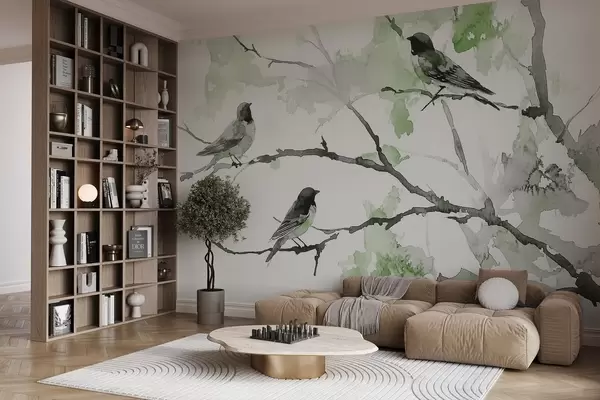 Fototapet Fåglar på trädgrenar i akvarellstil Nr. w09064v3