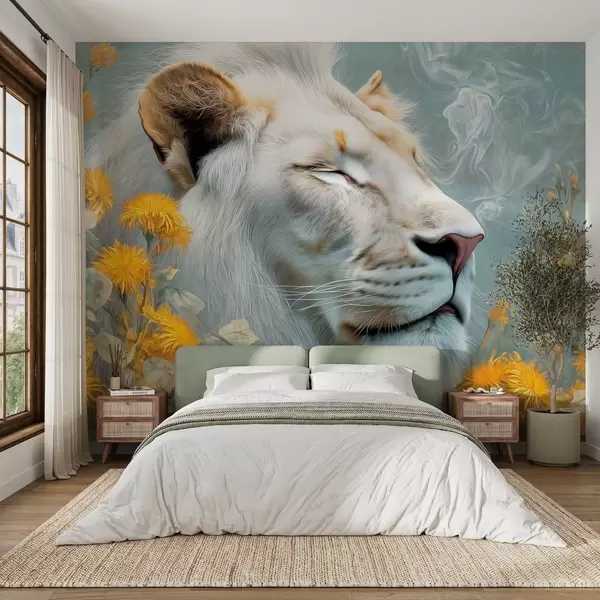 Fototapet Ett vitt lejon omgivet av gula blommor och rök Nr. w09080