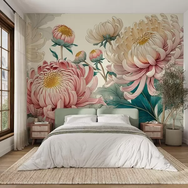 Fototapet Intrikat målning av vita och rosa krysantemum Nr. w09081