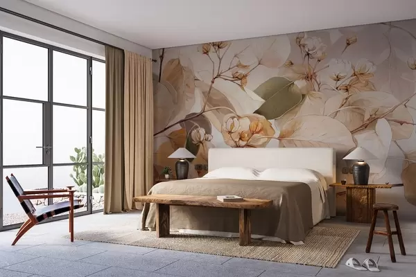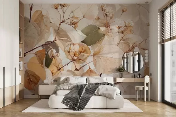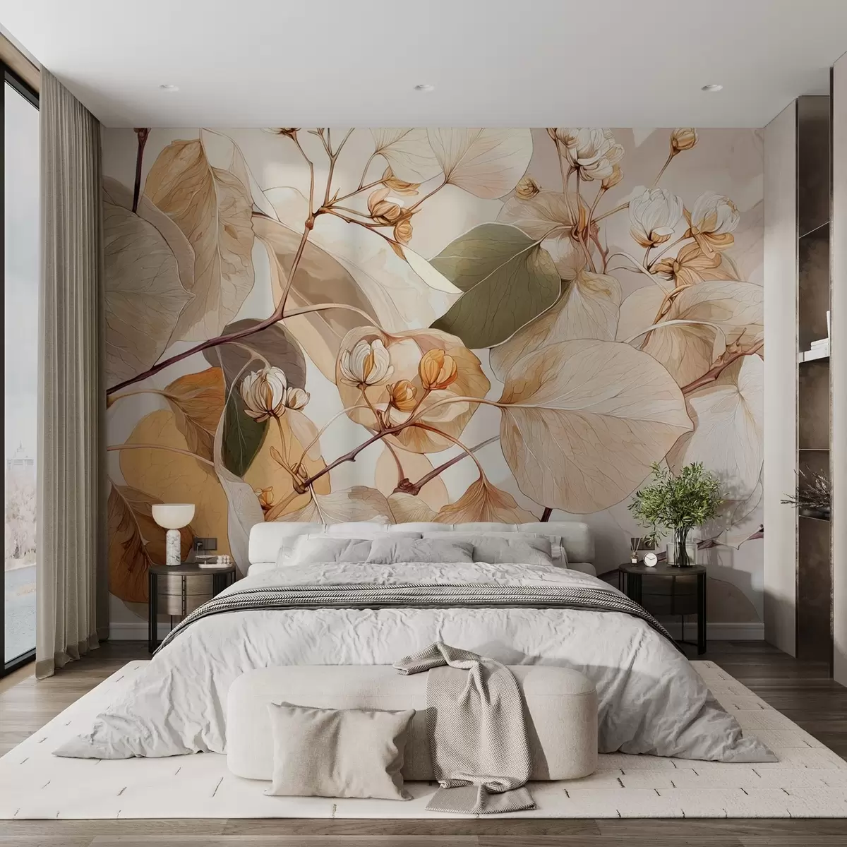 Fototapet Grenar av asplöv och blommor i oljemålningsstil i beige toner Nr. w09082