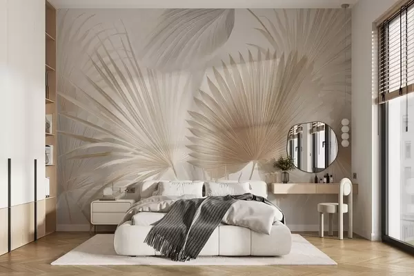 Fototapet Mjuka tropiska bladfläktar i ljusbeige och blåaktiga toner Nr. w09084