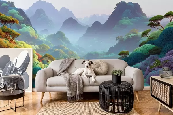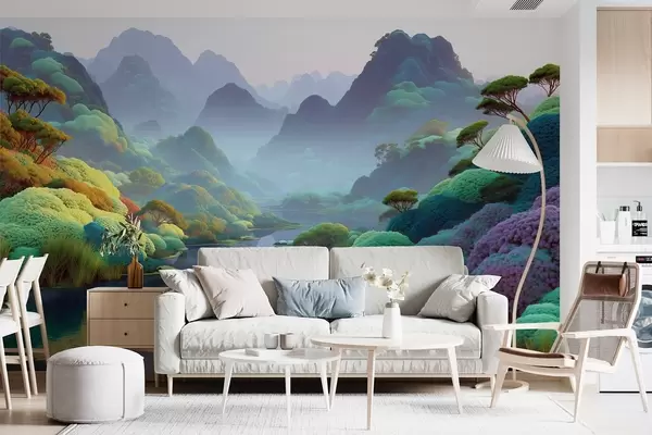 Fototapet Bergslandskap med en flod i blå toner med träd och buskar Nr. w09088