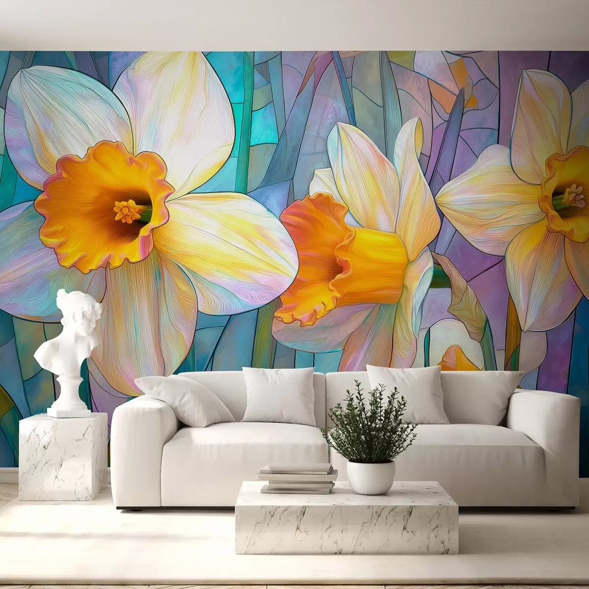 Fototapet Färgglada påskliljor på en blåviolett bakgrund av färgat glas Nr. w09092