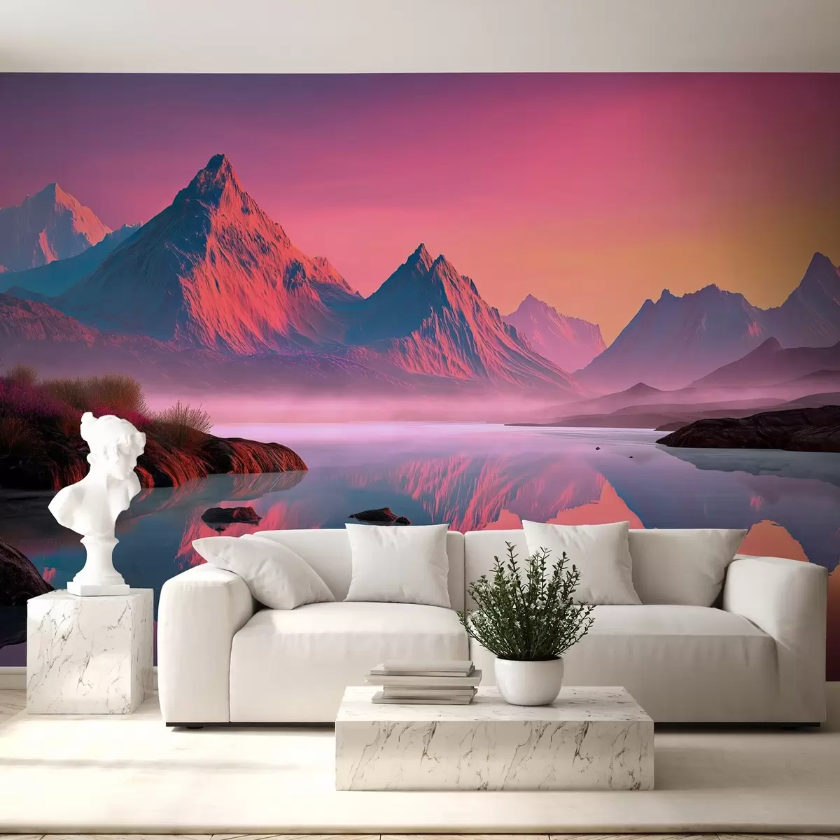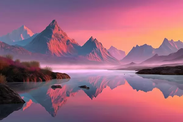 Fototapet Romantiskt solnedgångslandskap med en flod och berg i rosa nyanser Nr. w09093