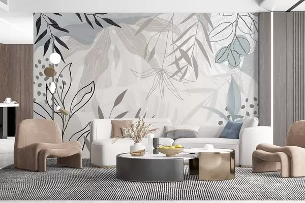 Fototapet Abstrakt blommig modern design med pastellfärgade beige, grå, blå och svarta blad, delikat linjekonst och mjuk bakgrund Nr. w09105