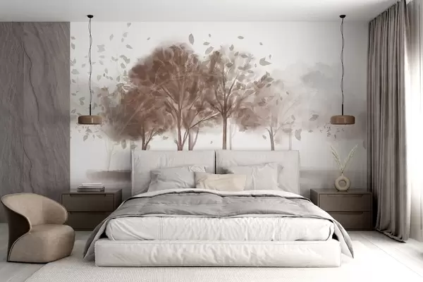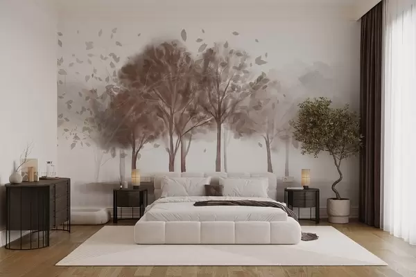 Fototapet Abstrakt landskap med träd med bruna löv som reflekterar i vattnet, i akvarell texturerad stil Nr. w09109v1