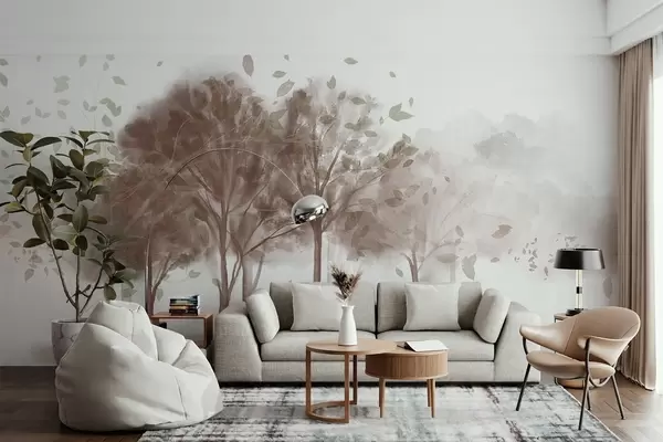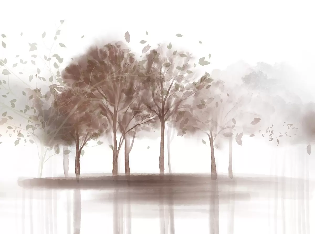 Fototapet Abstrakt landskap med träd med bruna löv som reflekterar i vattnet, i akvarell texturerad stil Nr. w09109v1