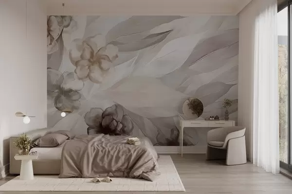 Fototapet Delikata blommor och blad i nyanser av vitt, brunt och beige blommig bakgrund , mjuka färger, delikata kronblad Nr. w09111v1