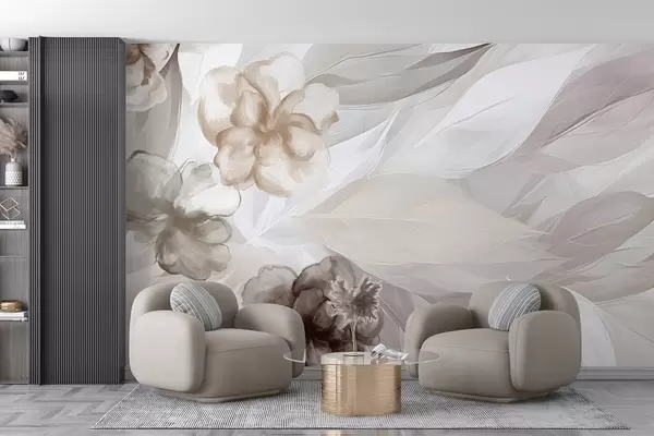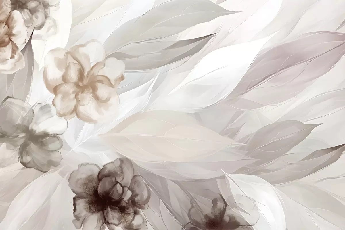 Fototapet Delikata blommor och blad i nyanser av vitt, brunt och beige blommig bakgrund , mjuka färger, delikata kronblad Nr. w09111v1