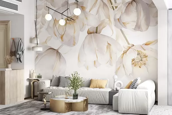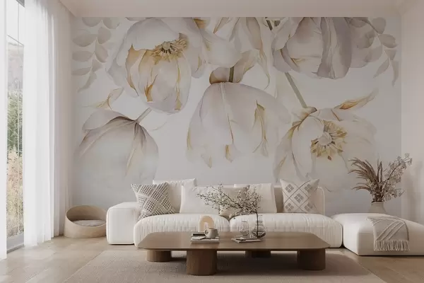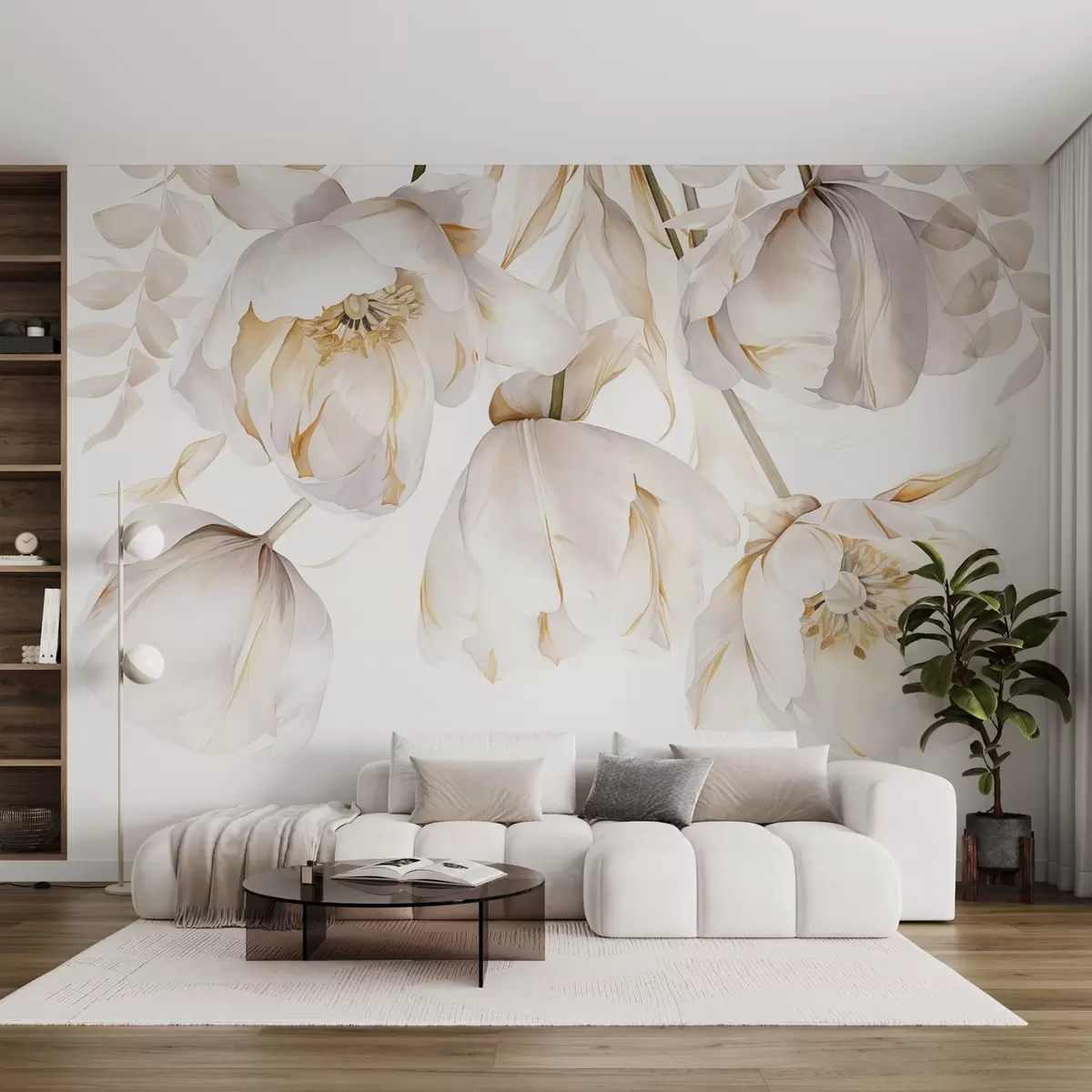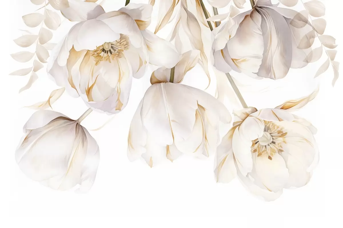 Fototapet Vita tulpaner med gula pistiller, skira kronblad, elegant blomsterarrangemang, skir komposition, mot en vit bakgrund Nr. w09112