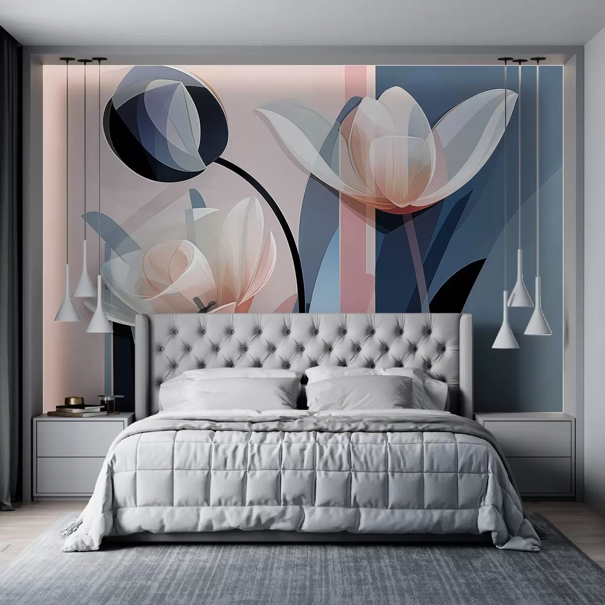 Fototapet Abstrakt modern design med tulpaner med genomskinliga kronblad i pastellfärger av rosa, vitt och mörkblått Nr. w09116