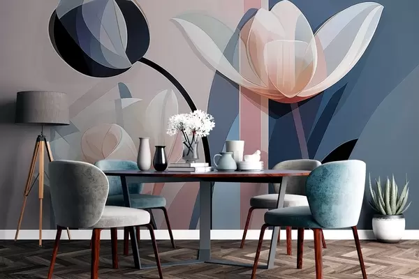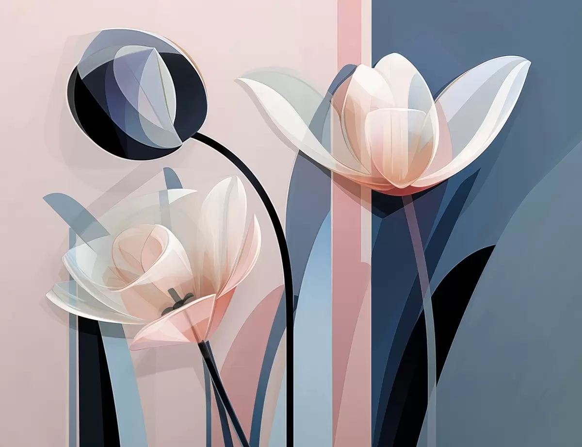 Fototapet Abstrakt modern design med tulpaner med genomskinliga kronblad i pastellfärger av rosa, vitt och mörkblått Nr. w09116