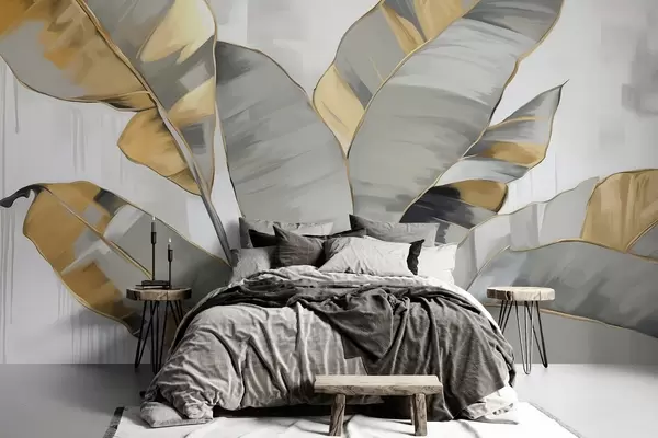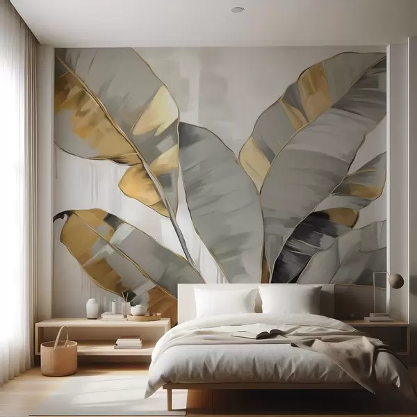 Fototapet Banan tropiska texturerade blad med grå och gula toner, modern stil, neutral bakgrund, dekorativ målning Nr. w09118
