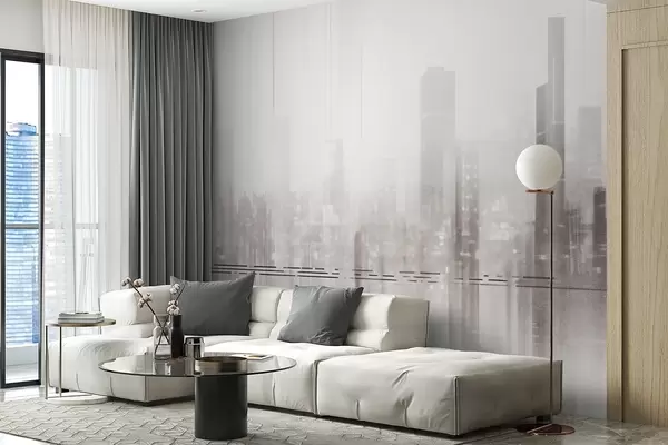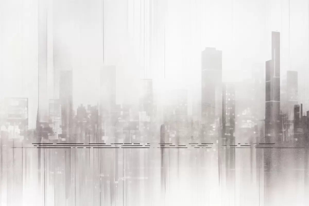 Fototapet Abstrakt texturerad stadsbild med höga byggnader och remsor, i nyanser av grått och vitt, vilket skapar en dimmig effekt Nr. w09119