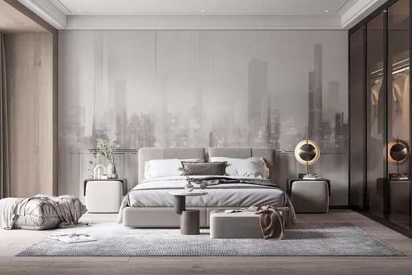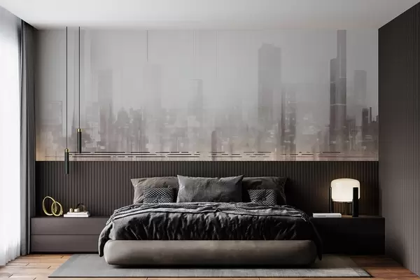Fototapet Abstrakt texturerad stadsbild med höga byggnader och remsor, i nyanser av grått och vitt, vilket skapar en dimmig effekt Nr. w09119