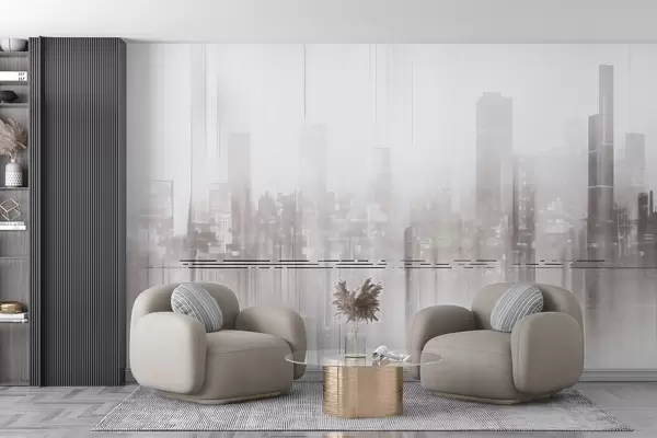 Fototapet Abstrakt texturerad stadsbild med höga byggnader och remsor, i nyanser av grått och vitt, vilket skapar en dimmig effekt Nr. w09119