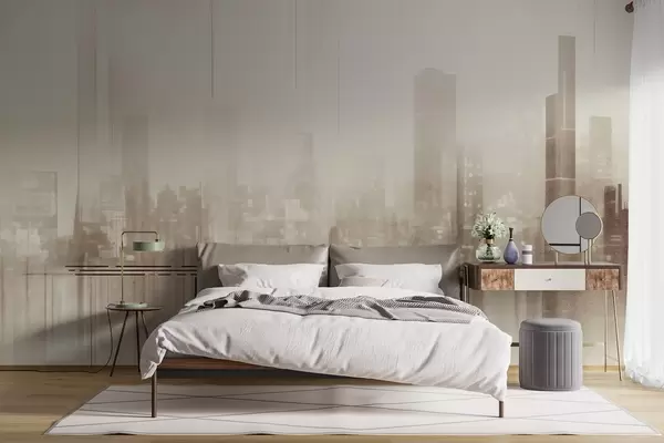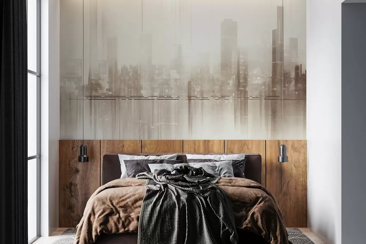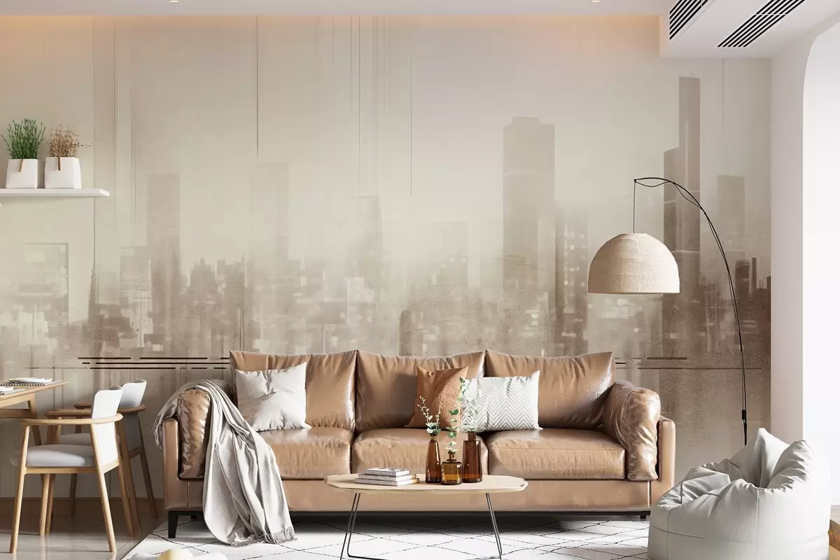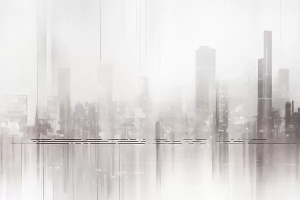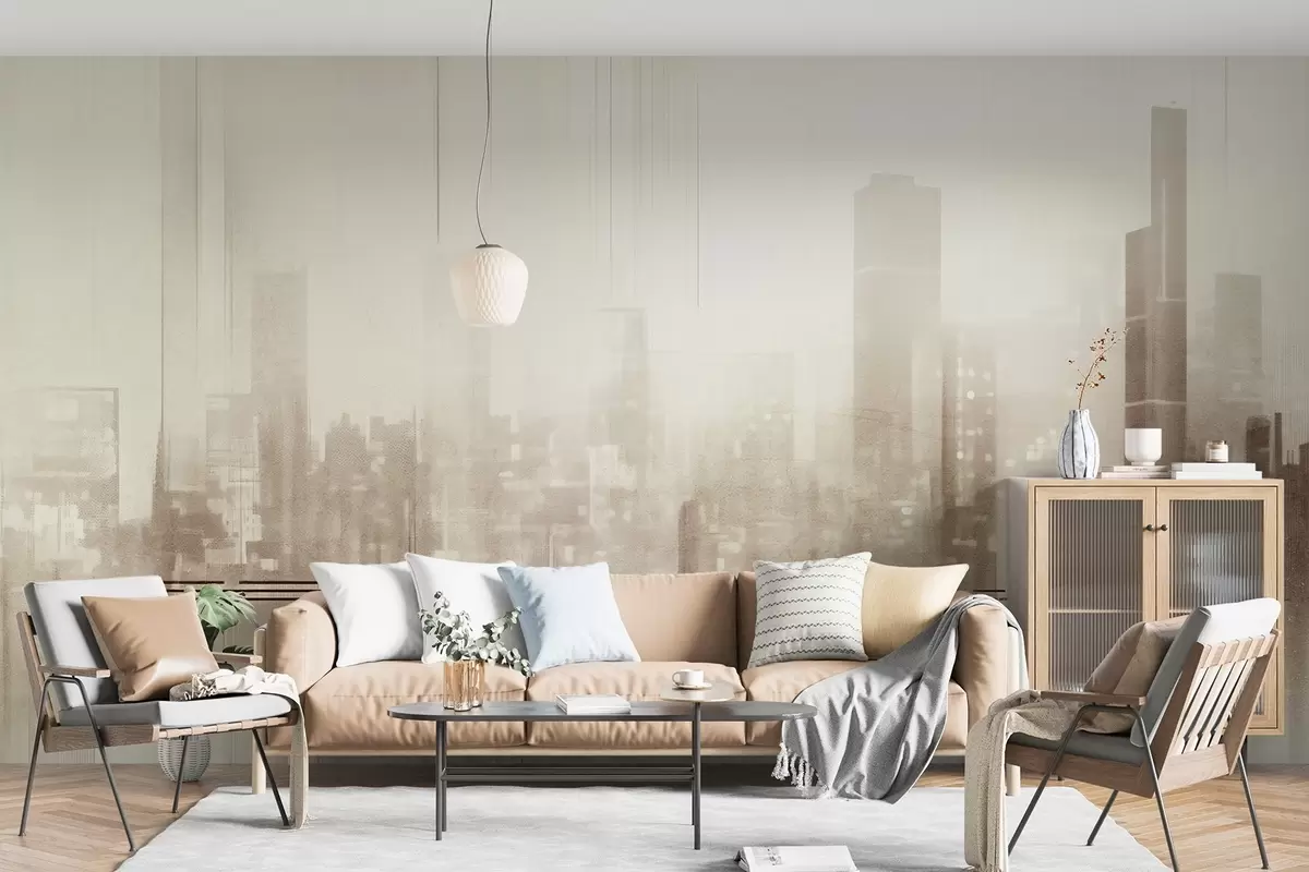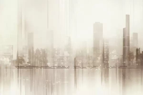 Fototapet Abstrakt texturerad stadsbild med höga byggnader och remsor, i nyanser av beige och vitt, vilket skapar en dimmig effekt Nr. w09119v1