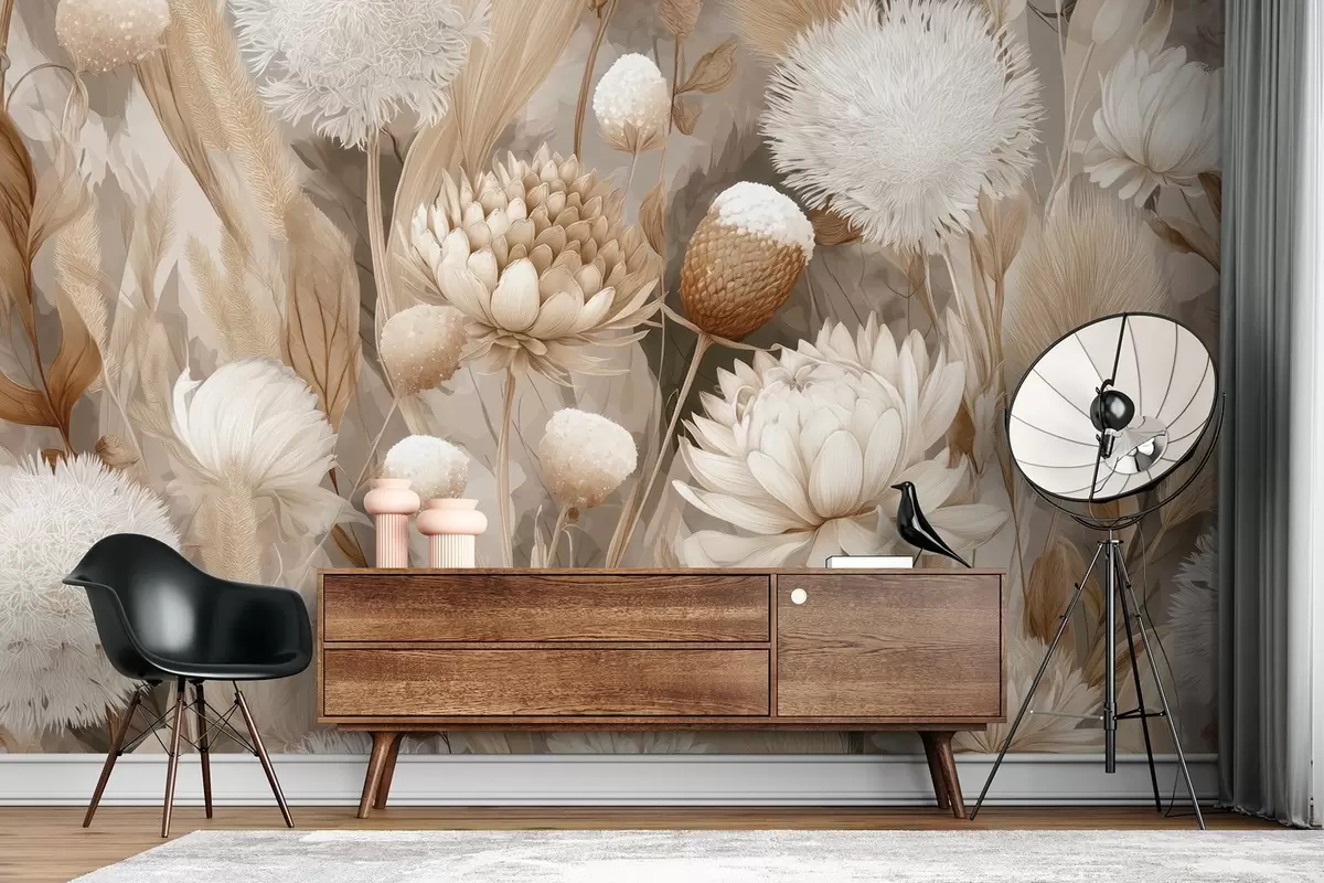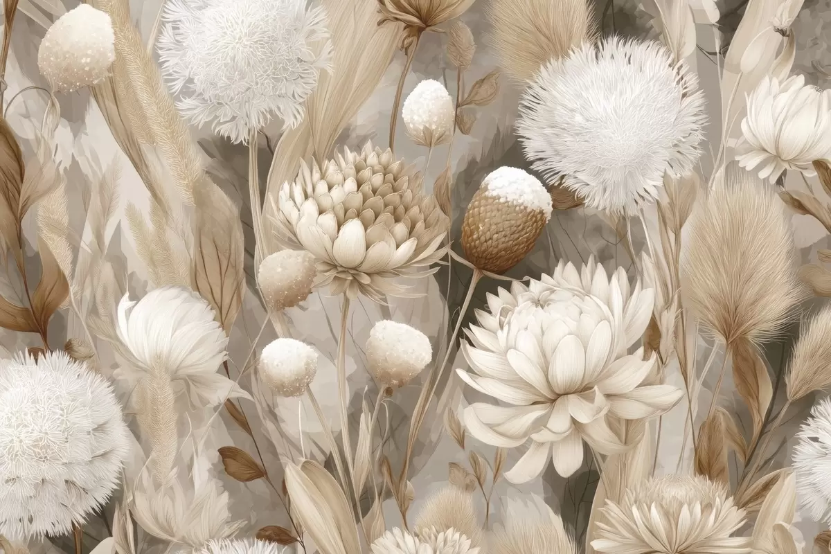 Fototapet Boho-harmoni: Texturerade blommor i beige och krämfärgade toner w09121