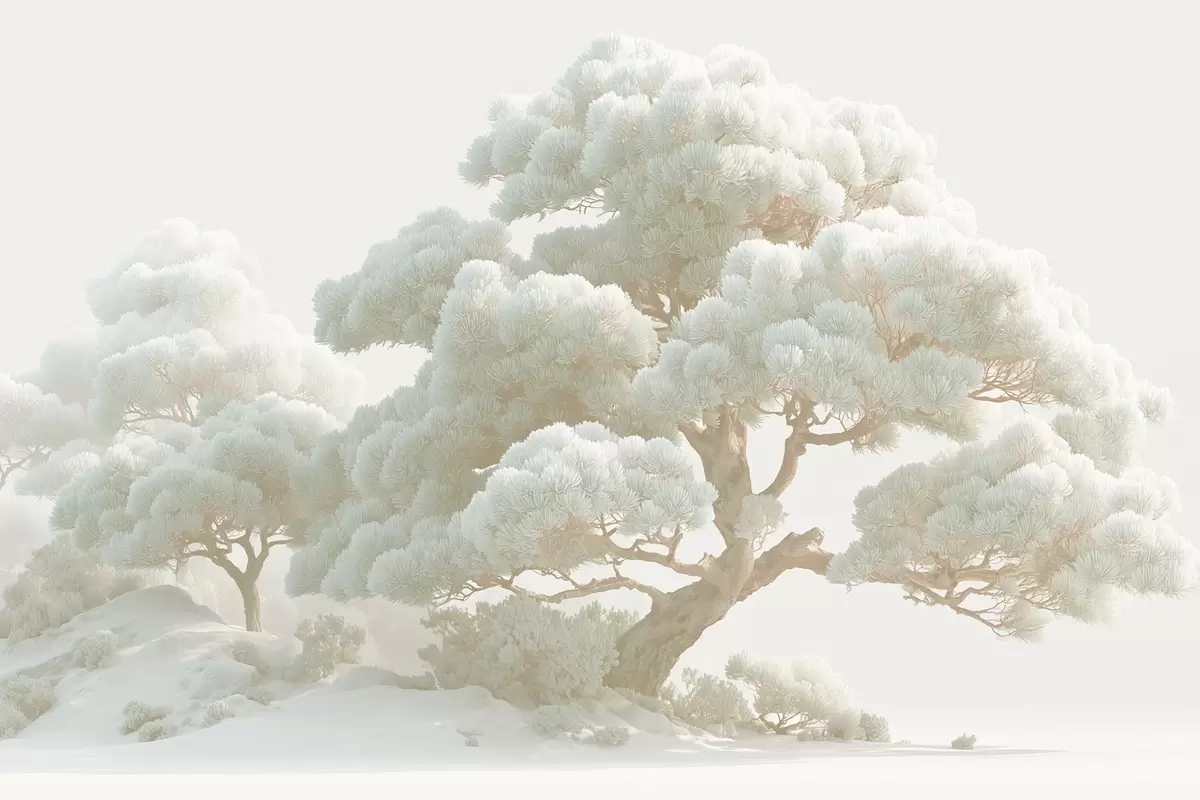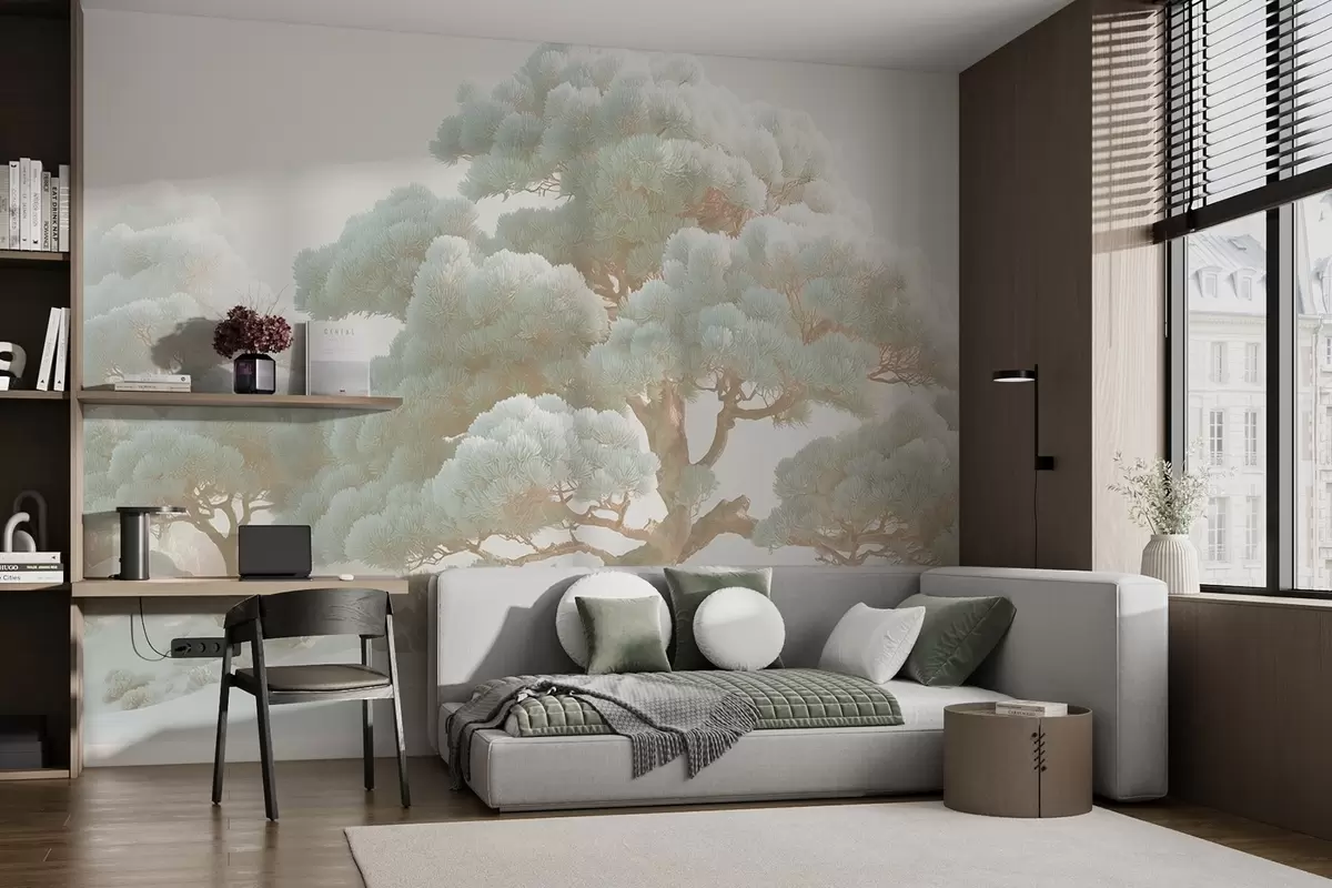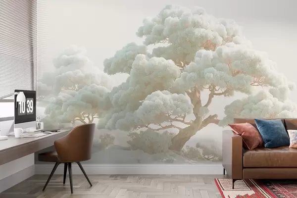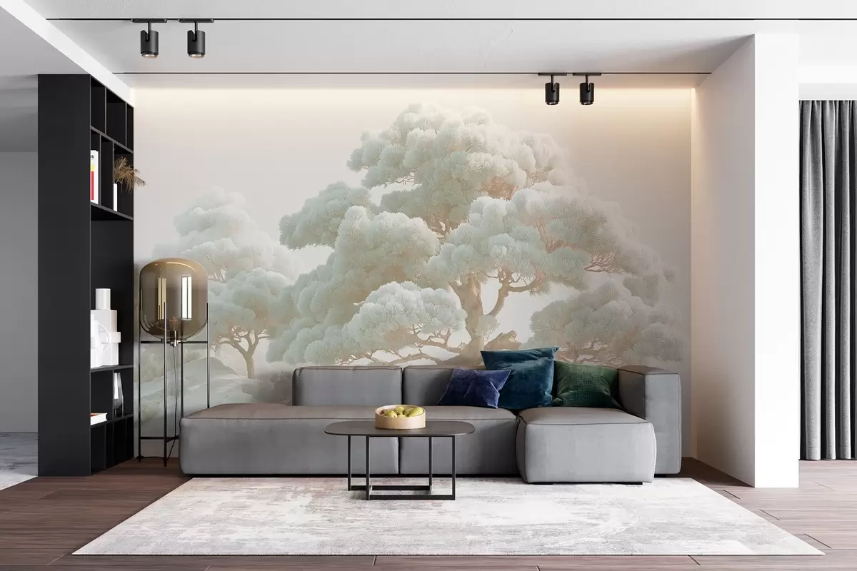 Fototapet Tallar i dimma i mjuka toner stående i en skog Nr. w09122