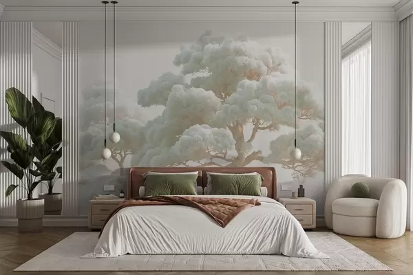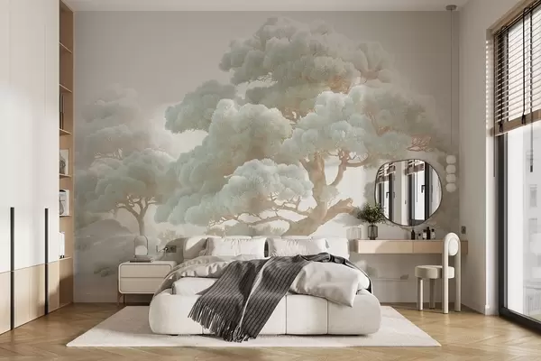 Fototapet Tallar i dimma i mjuka toner stående i en skog Nr. w09122