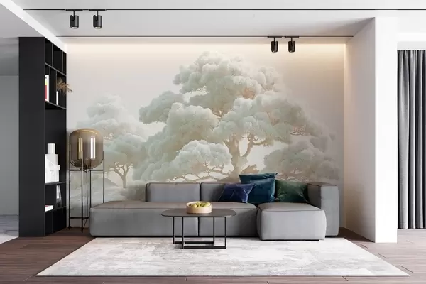 Fototapet Tallar i dimma i mjuka toner stående i en skog Nr. w09122