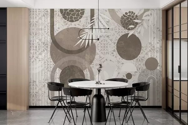 Fototapet Abstrakta texturella geometriska former i brunt och vitt, cirklar, bågar och botaniska element, modern och minimalistisk design Nr. w09130