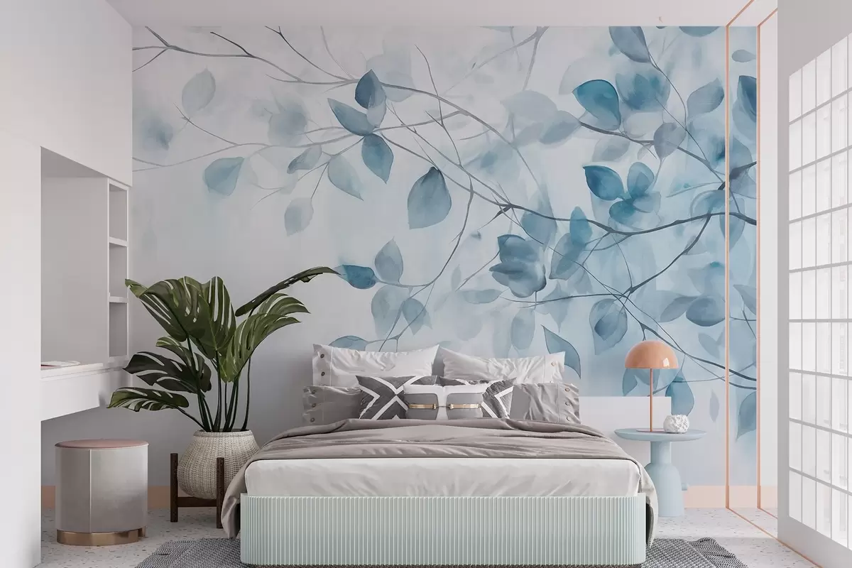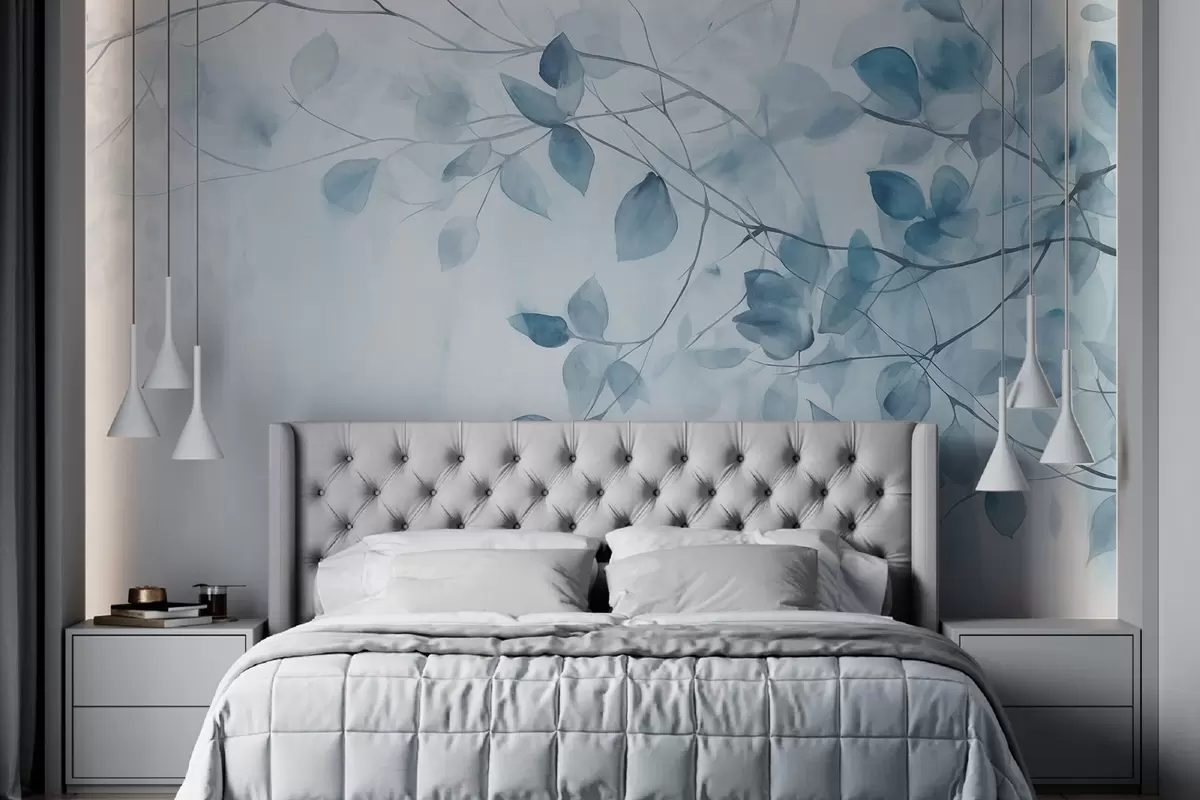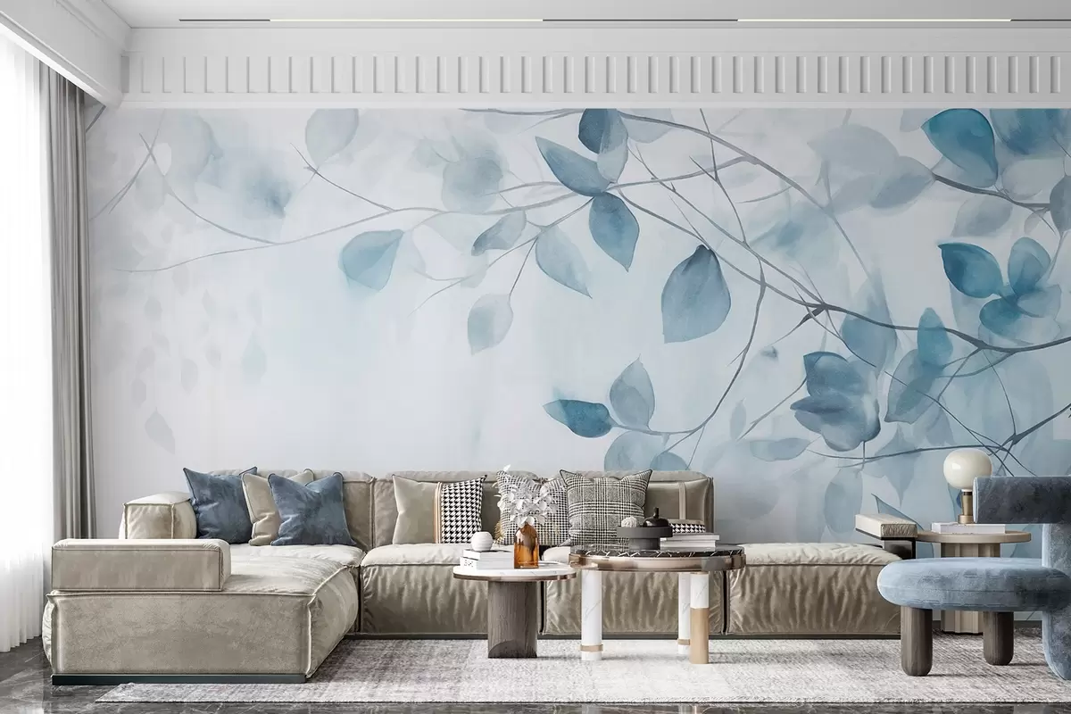 Fototapet Texturell akvarellmålning med imitation av blå blad och grenar, mjuka färger, fina detaljer mot en vit bakgrund Nr. w09133v1