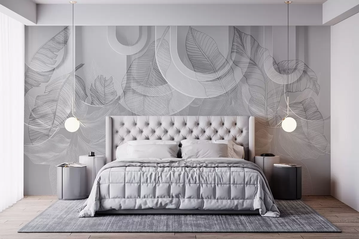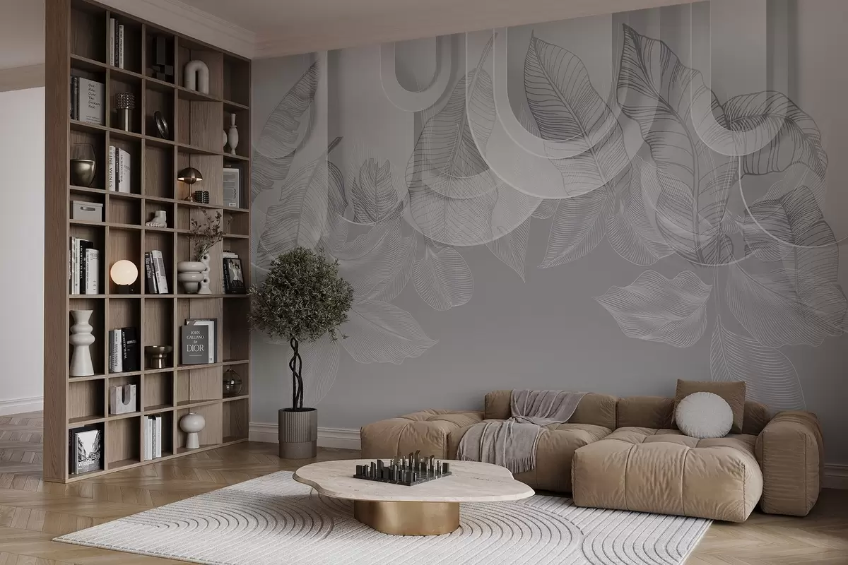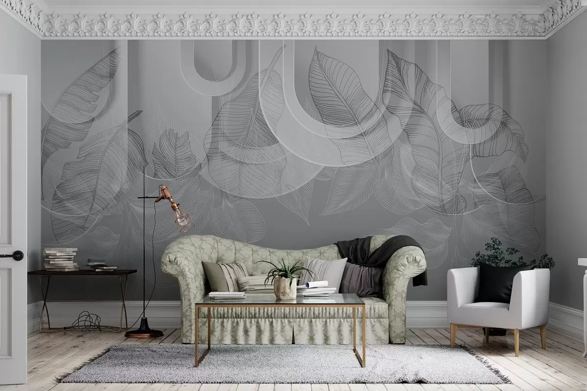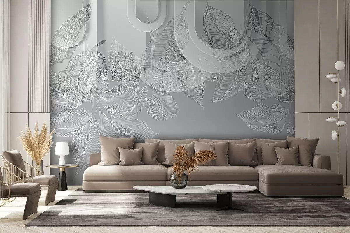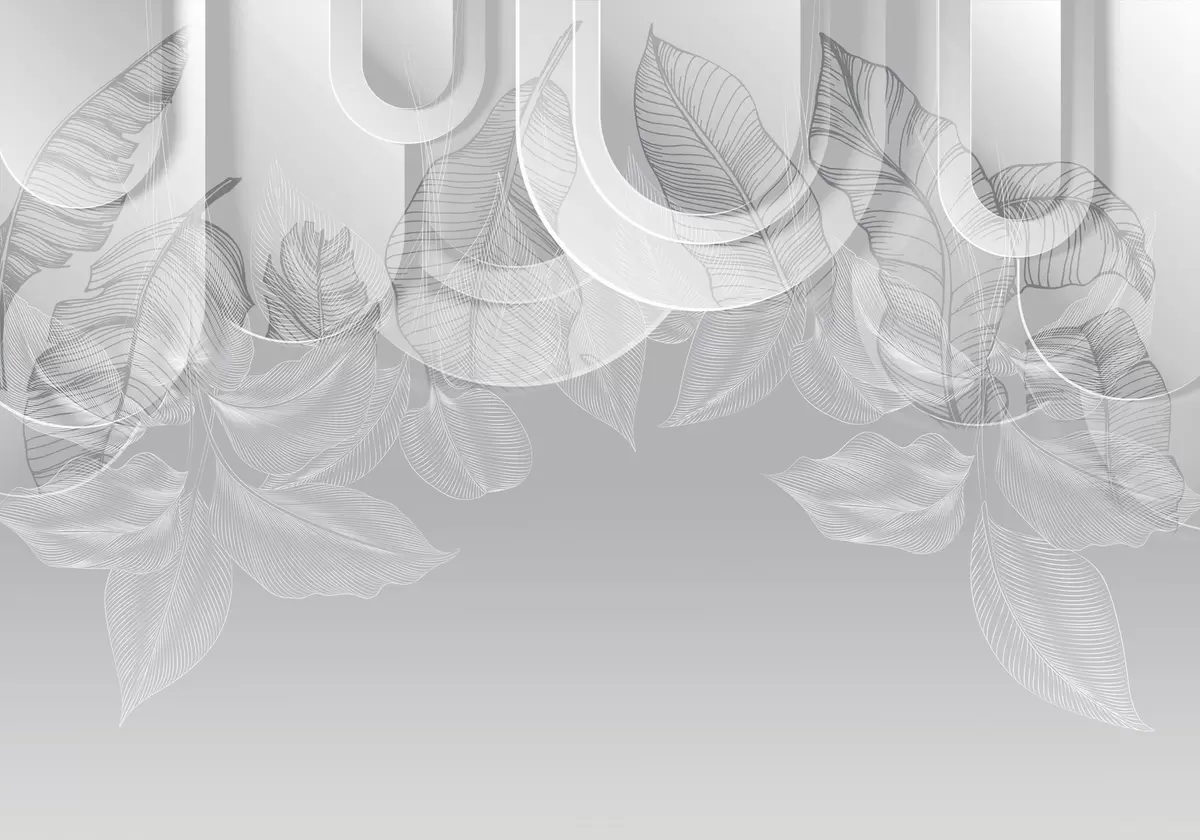 Fototapet Abstrakt bakgrund med grå valvbågar och vita tropiska blad, minimalistisk design, elegant och modern, neutral färgpalett Nr. w09138