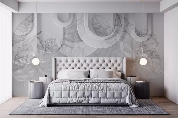 Fototapet Abstrakt bakgrund med grå valvbågar och vita tropiska blad, minimalistisk design, elegant och modern, neutral färgpalett Nr. w09138