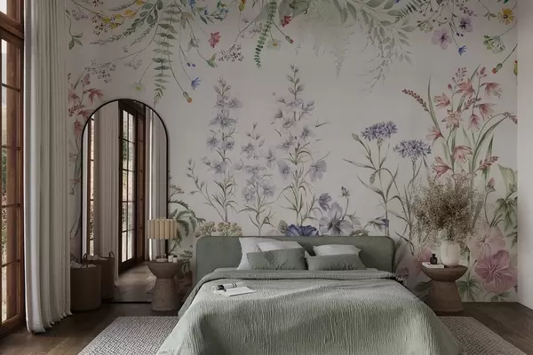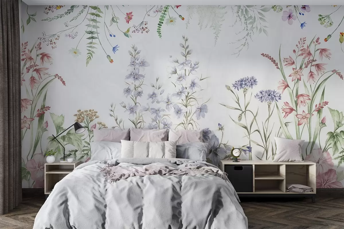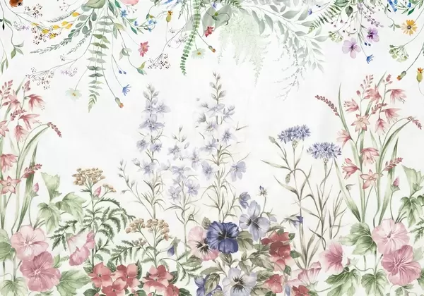 Fototapet Blommigt texturarrangemang med färgglada blommor och gröna blad, botanisk illustration, mjuka pastellfärger, vintagestil Nr. w09143