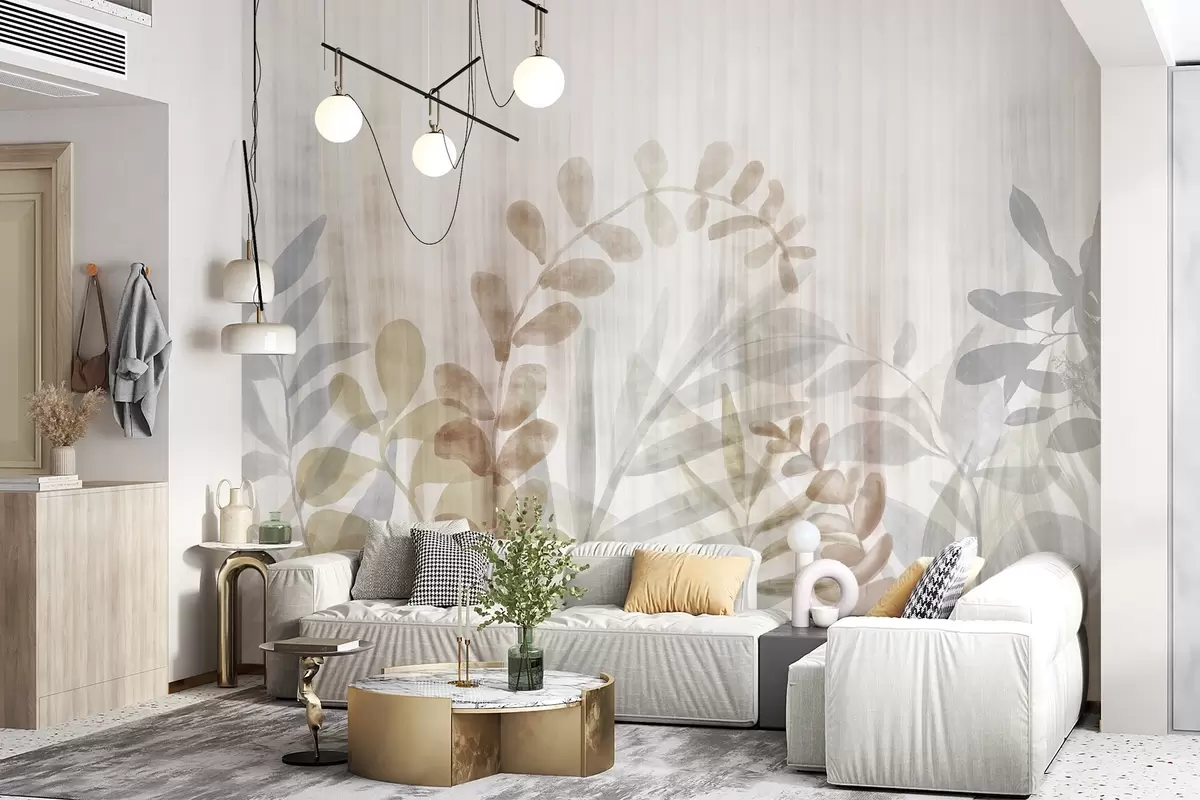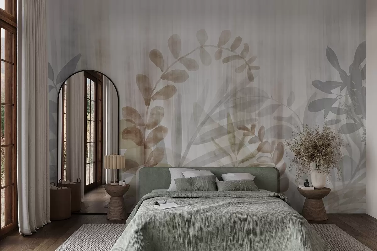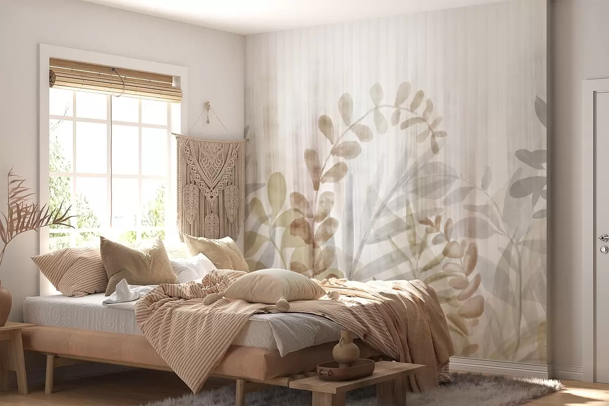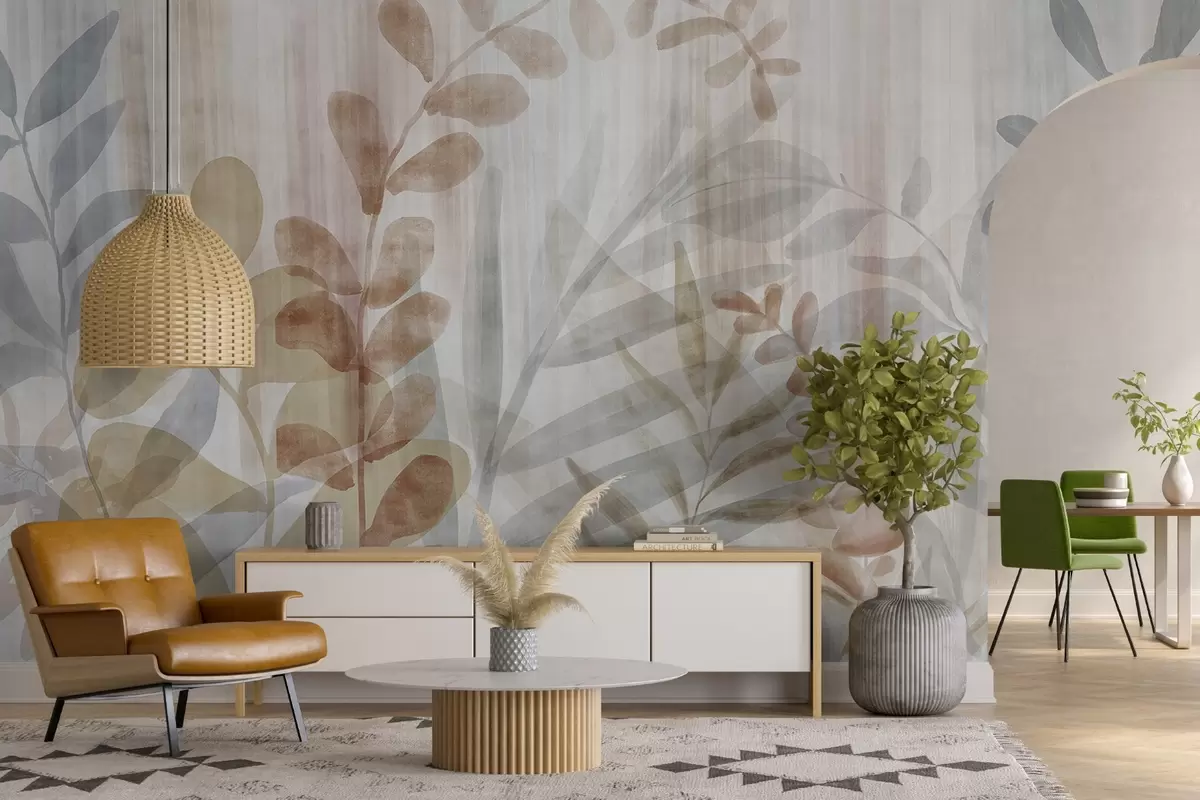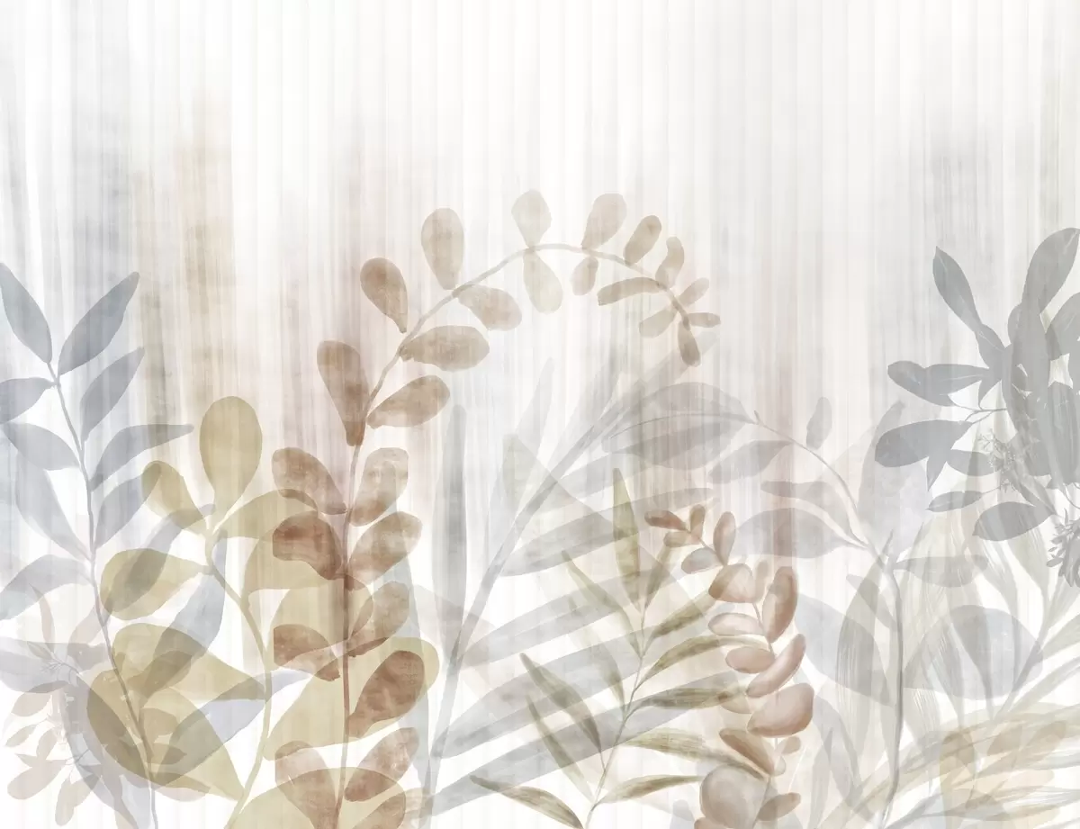 Fototapet Akvarellmålning med imitation av växter med flerfärgade dämpade blad, ljus bakgrund med vertikala linjer, botanisk illustration Nr. w09146
