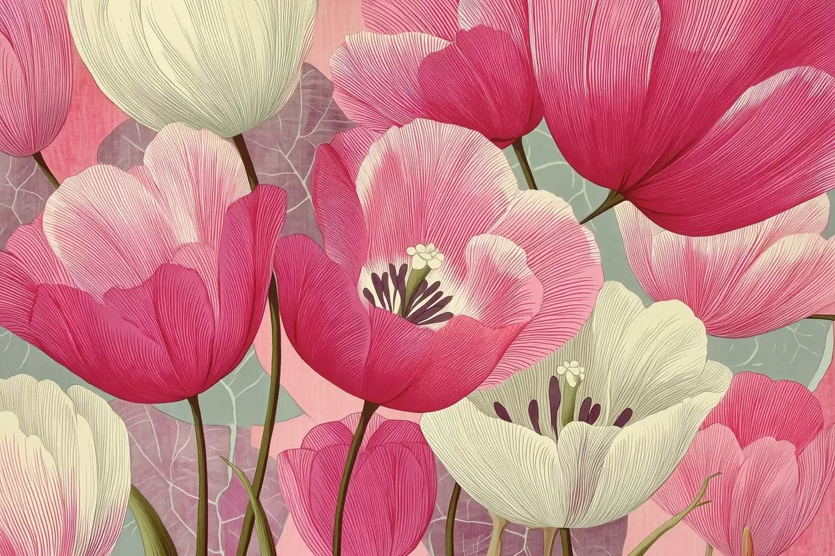 Fototapet Färgglada vallmor med grafiska blad i bakgrunden w09152