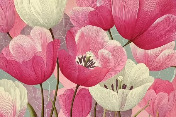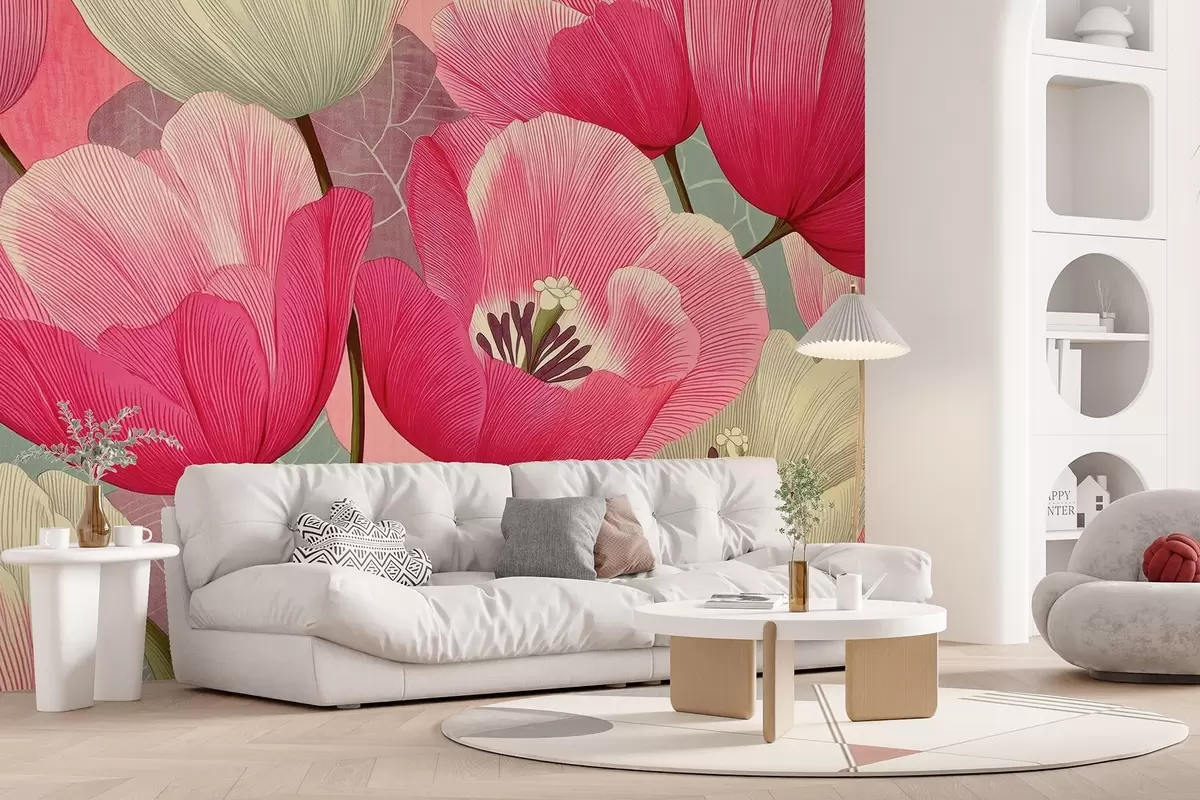 Fototapet Färgglada vallmor med grafiska blad i bakgrunden Nr. w09152