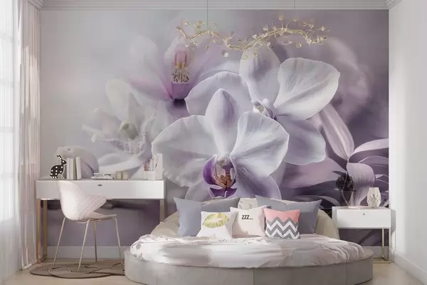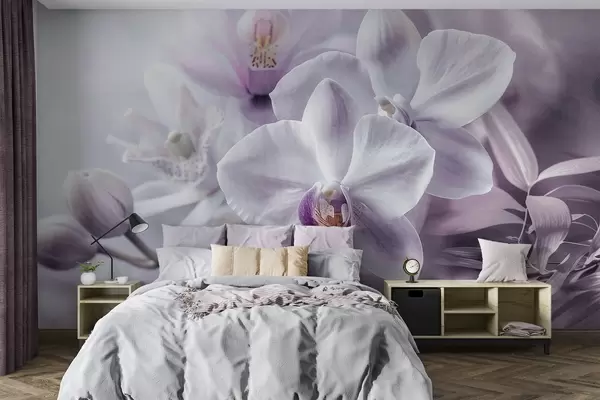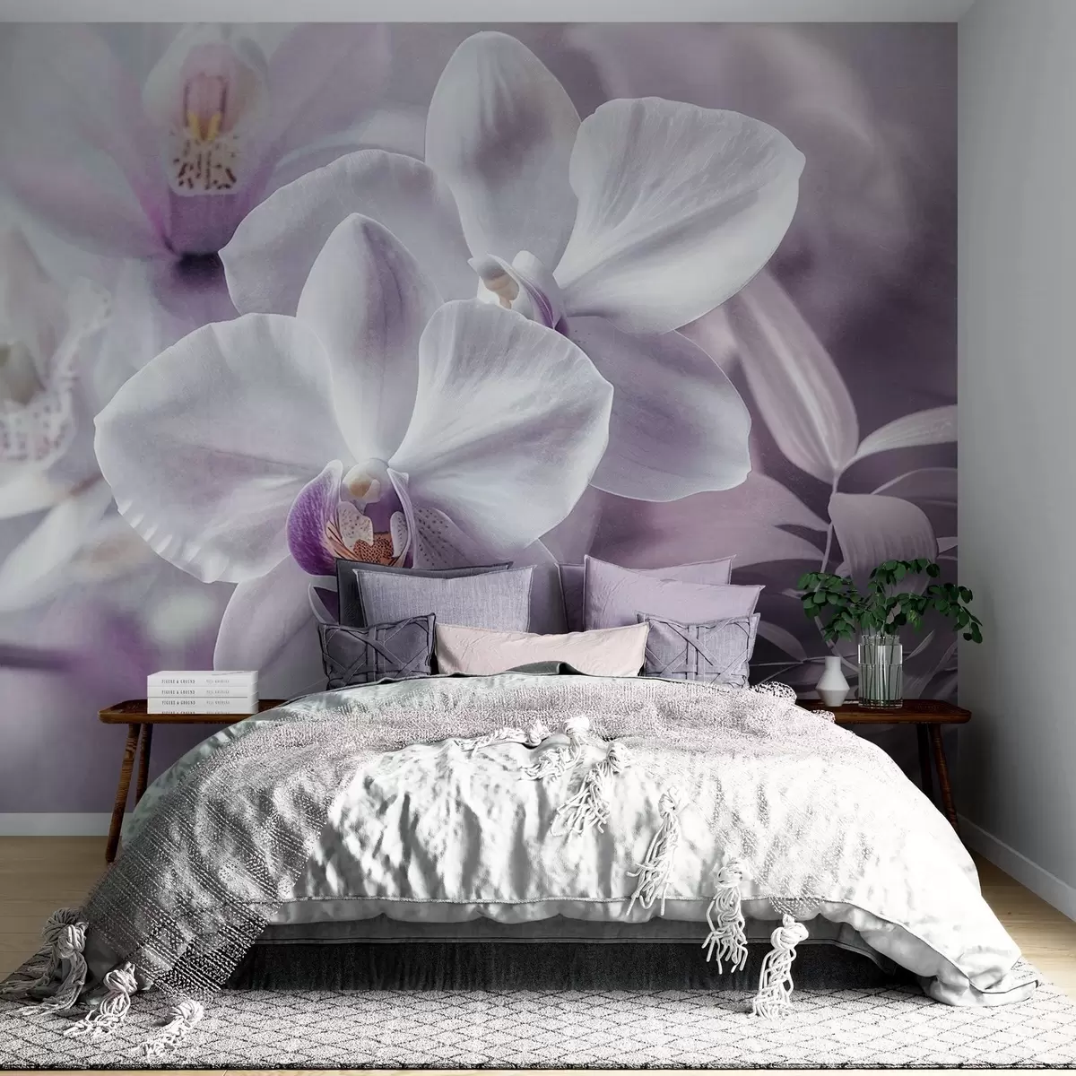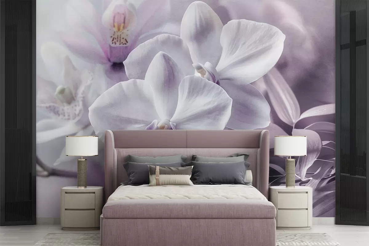Fototapet Vita och lila delikata orkidéblommor, mjuk belysning och en oskarp texturerad bakgrund Nr. w09155