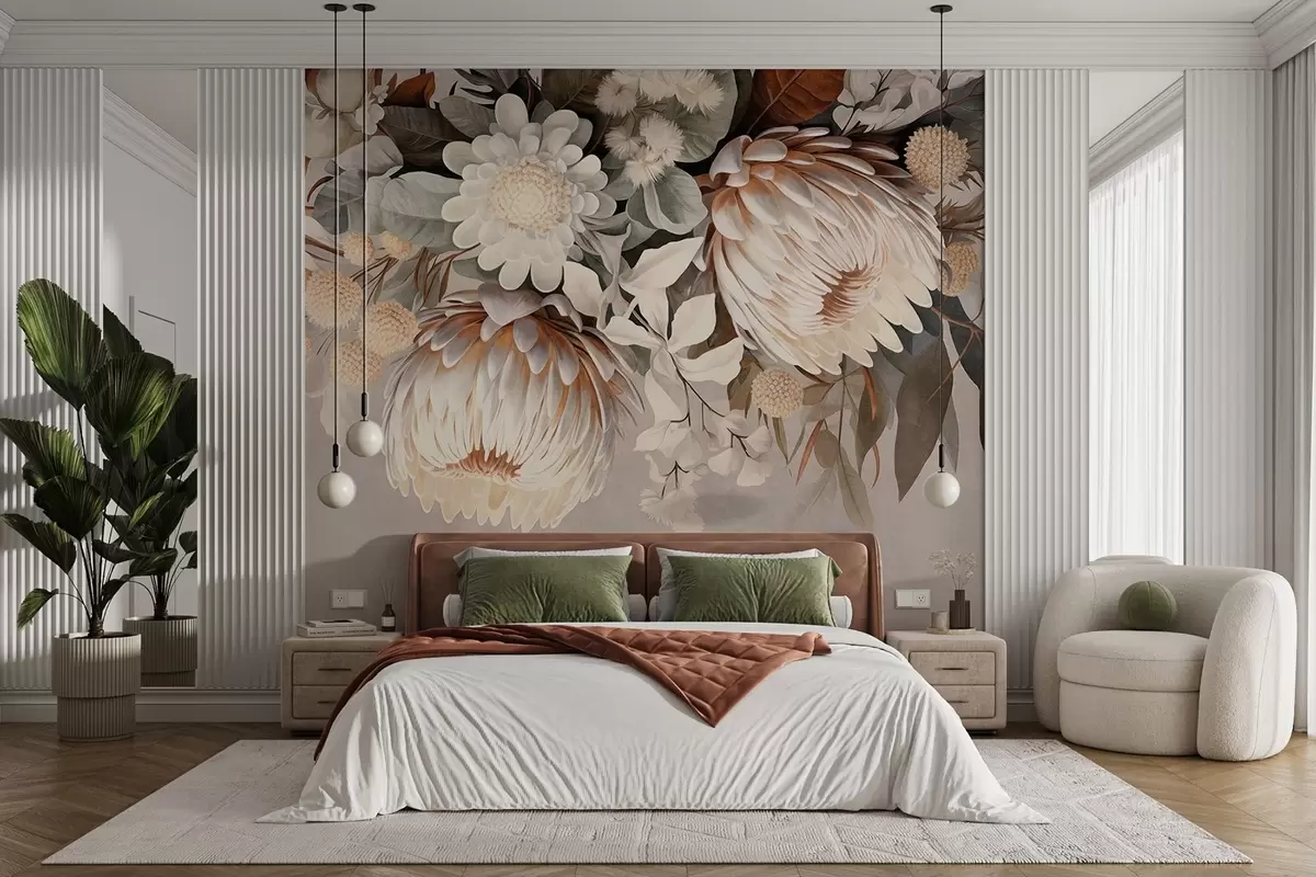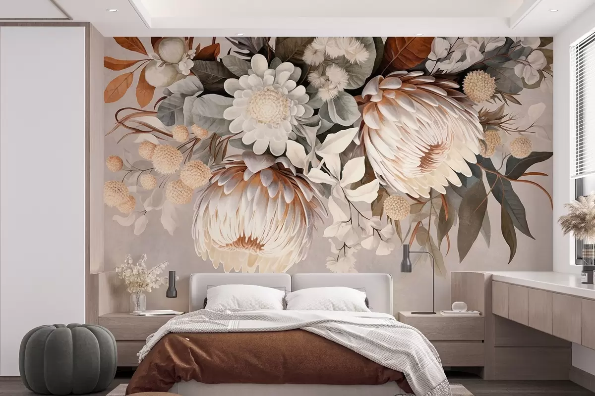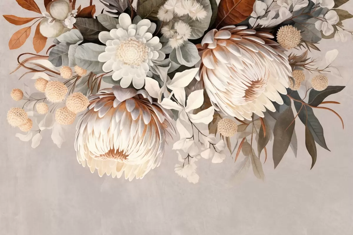 Fototapet Stor strukturerad protea med bruna accenter, vita prästkragar och gula blommor, beige dämpad bakgrund Nr. w09157