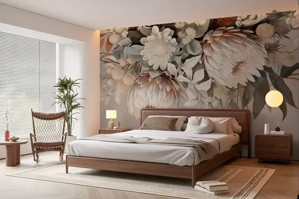 Fototapet Stor strukturerad protea med bruna accenter, vita prästkragar och gula blommor, beige dämpad bakgrund Nr. w09157