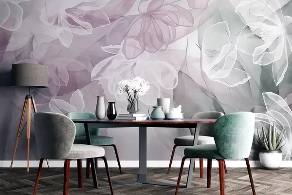 Fototapet Blommor och blad med genomskinliga kronblad i nyanser av vitt, rosa och grönt, mjuka och skira Nr. w09158v1