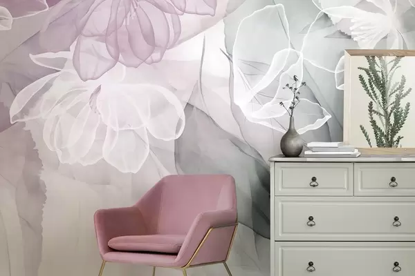 Fototapet Blommor och blad med genomskinliga kronblad i nyanser av vitt, rosa och grönt, mjuka och skira Nr. w09158v1