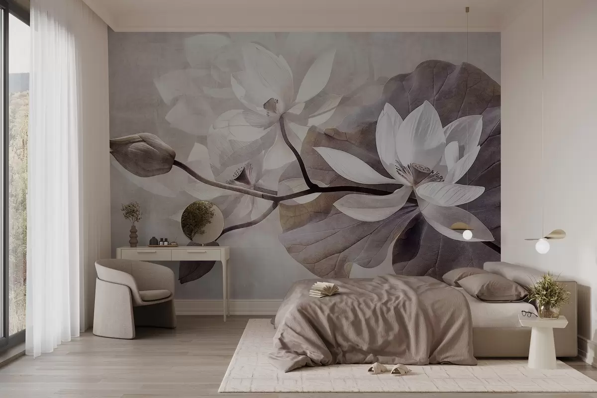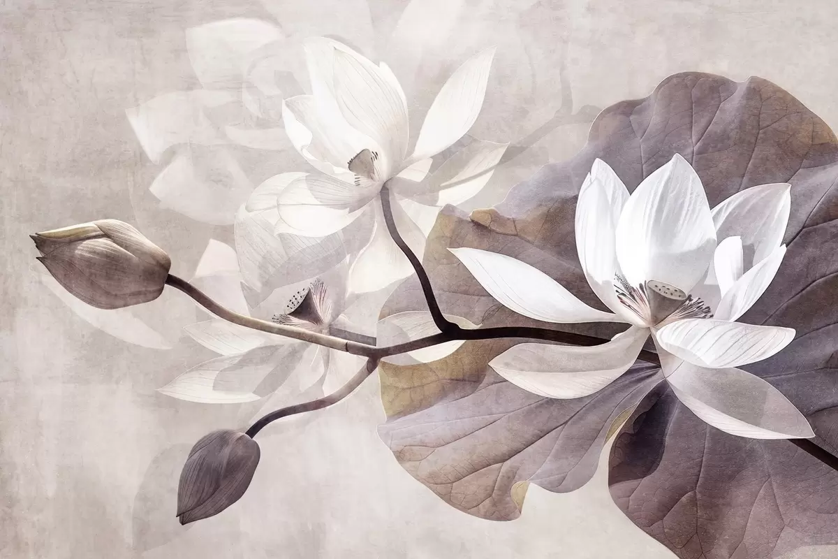 Fototapet Kornig texturerad dämpad delikat lotusblomma med blad och stjälkar i en mjuk, beige färgpalett Nr. w09159
