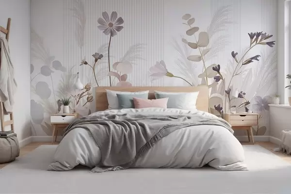Fototapet Blommor i pastellfärger, ljusbruna blad, vit bakgrund med vertikala linjer, elegant och minimalistisk Nr. w09161