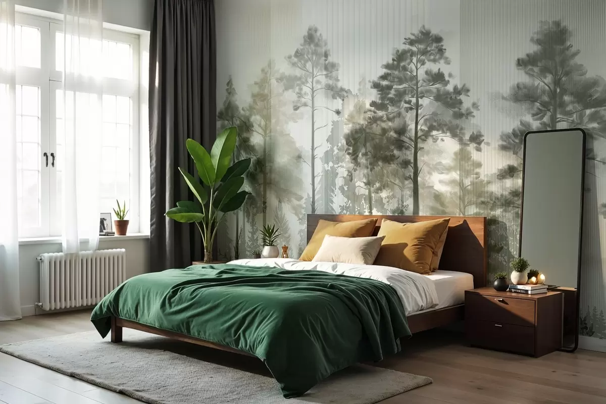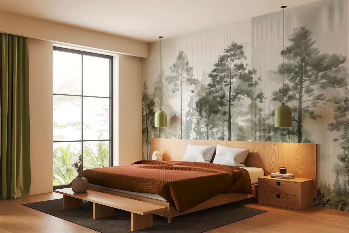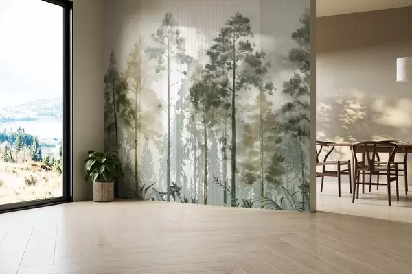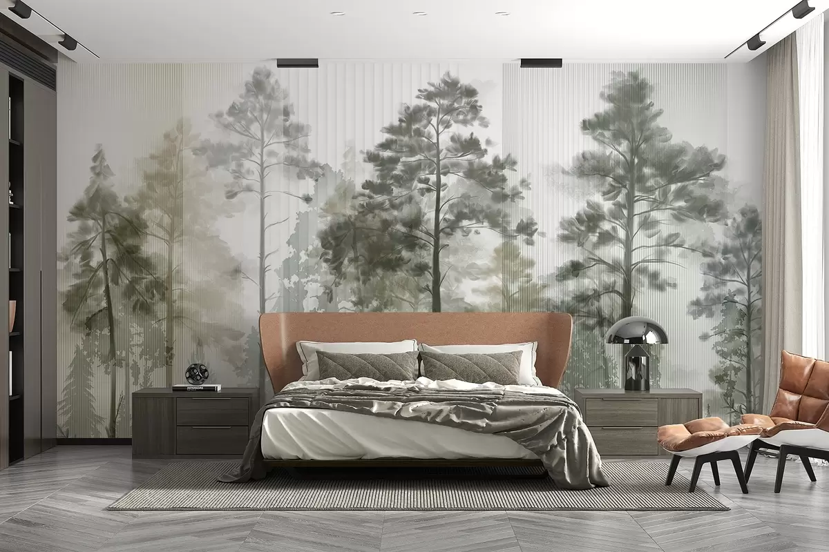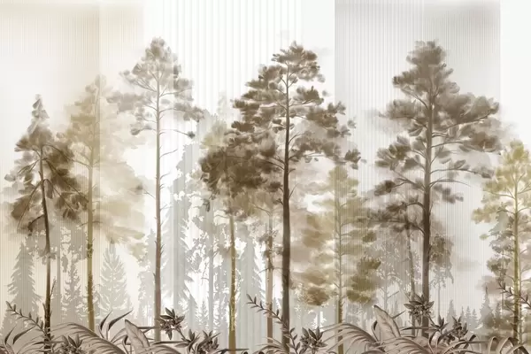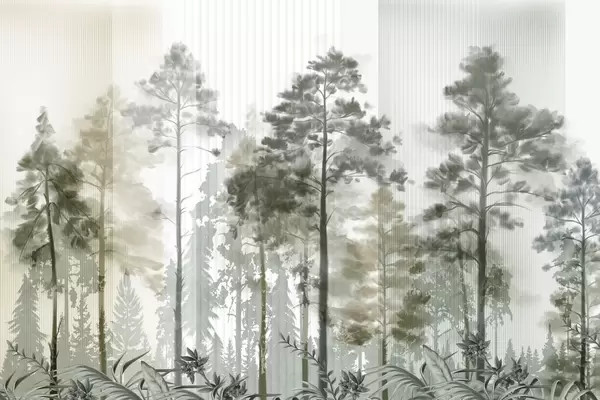 Fototapet En tät skog med höga tallar, frodiga gröna bladverk, en dimmig atmosfär med vertikala linjer texturer Nr. w09163