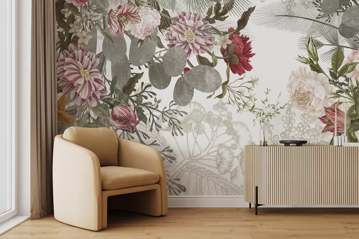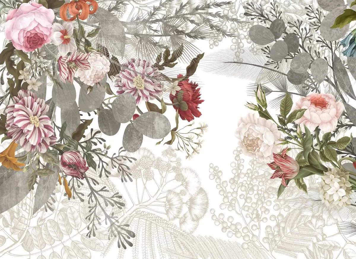 Fototapet Vintage-blomarrangemang med rosor, eukalyptus och mimosa i dämpade gröna, röda och rosa nyanser Nr. w09164v1