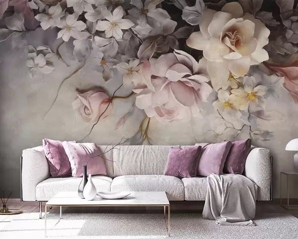 Fototapet Stora blommor som hänger nerför väggen på en betongbakgrund Nr. w09184