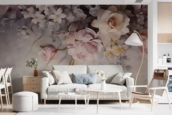 Fototapet Stora blommor som hänger nerför väggen på en betongbakgrund Nr. w09184